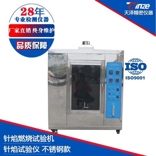 針焰試驗儀是用規定尺寸(Φ0.9mm )的針狀燃燒器,通以特定燃氣(丁烷),以 45°角定時定向施燃試品,視試品是否引燃及持燃時間和燃燒長度來評定設備內部因故障條件造成的小火焰的著火危險性。